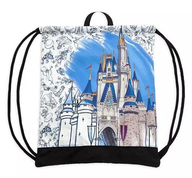 Feel like art world royalty as you tour Walt Disney World Resort with your essentials tucked into our Ink & Paint cinch sack. The front features a stunning rendering of Cinderella Castle, partially colored and partially in sketch, plus a pattern of classic Disney characters on the rest of the satin bag’s surface.