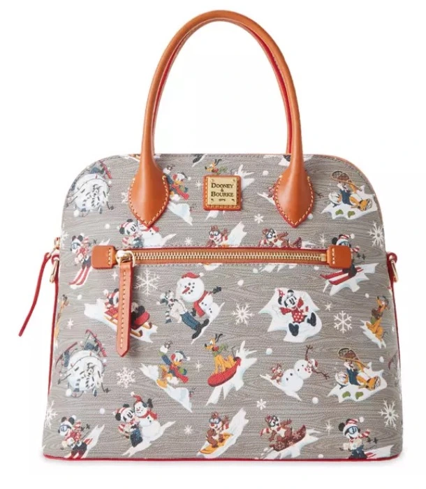 Celebrate the magic of the winter season with this stylish dome satchel from Dooney & Bourke. Featuring an allover pattern of Mickey, Minnie, Donald, Goofy, Pluto, and Chip ‘n Dale frolicking amid a flurry of snowflakes against a wood grain design, this jolly bag features a zippered main compartment with multiple pockets, a removable shoulder strap, and top carry handles.