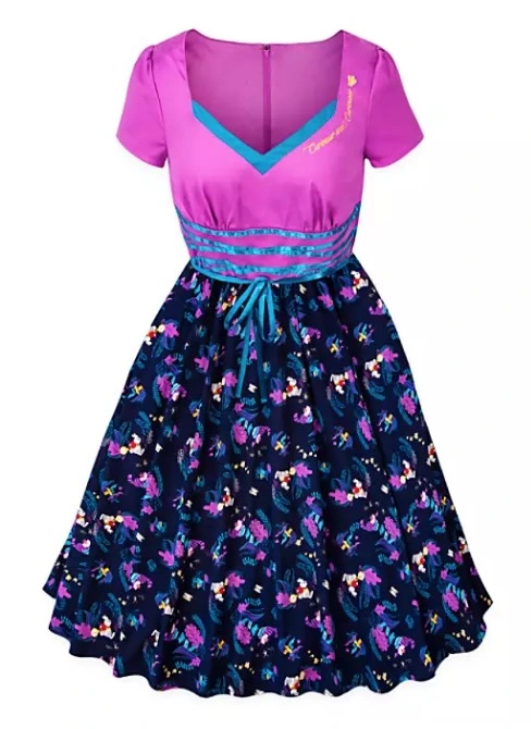 Drop into the topsy-turvy world of fine fashion in this dreamy retro-style dress by Her Universe, inspired by Walt Disney’s animated classic Alice in Wonderland. The White Rabbit, Cheshire Cat, and Caterpillar populate a colorful print skirt, while embroidered detailing and satin trims combine to make heads spin.