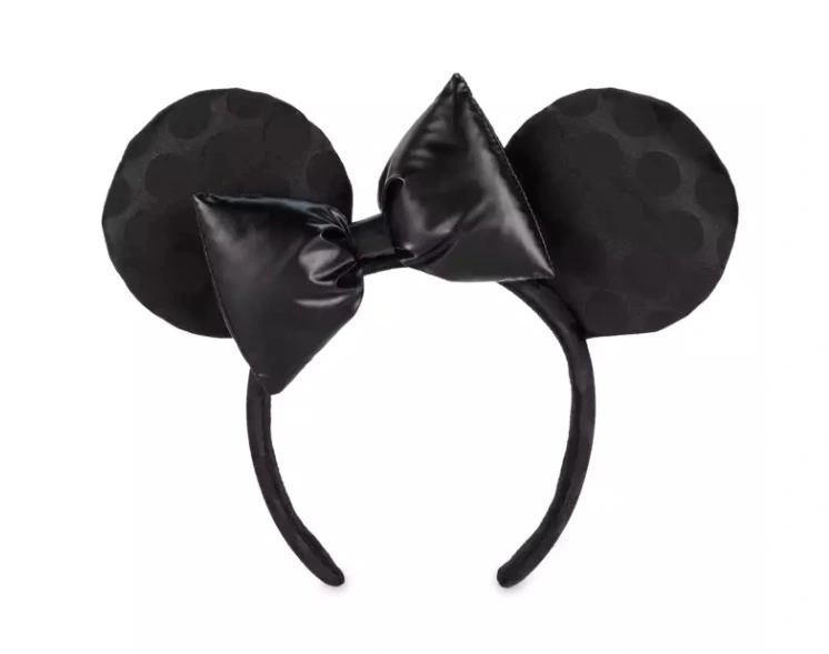 These Black on Black Minnie Mouse Ears Features a Faux leather Bow with polka dot ears.