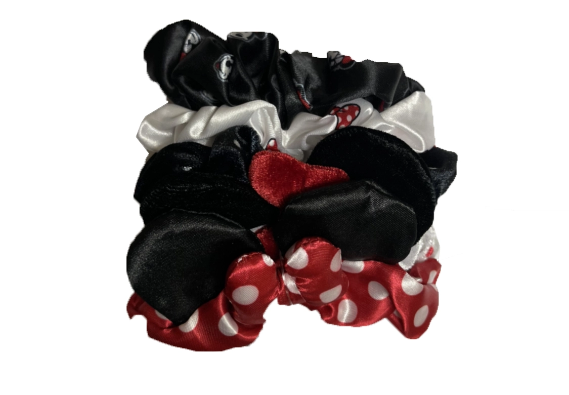 Wear a piece of Disney, with these fun hair scrunchies. Features 3 scrunchies, with the Minnie Dots, Bows, and Minnie.