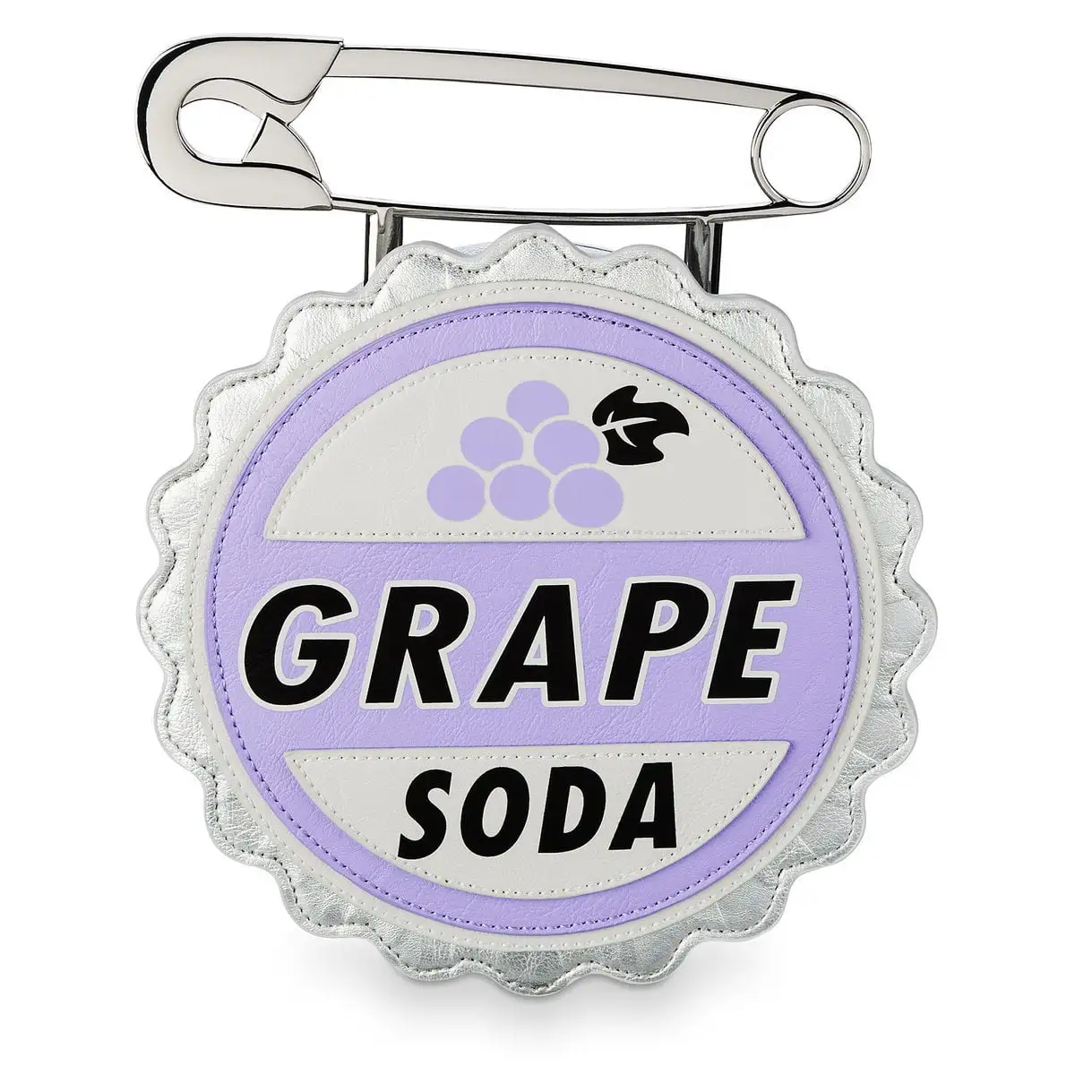 Raise your style game with our Up-inspired handbag. Ellie’s grape soda badge for Carl makes a sweet, chic accent to any look with its die-cut shape, grape screen art, and a gleaming metal safety pin handle.