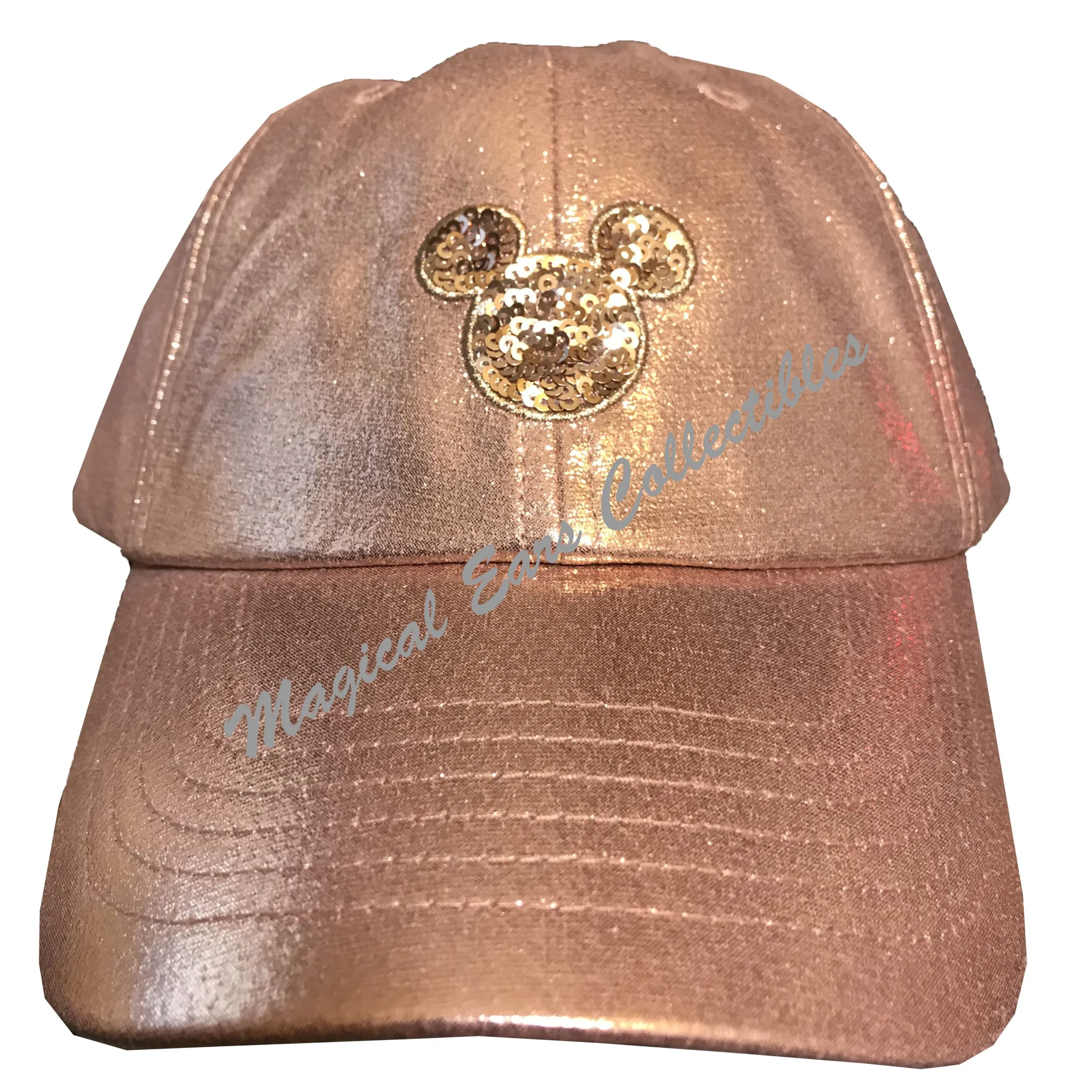 This Sparkly Mickey Mouse Baseball cap is Gorgeous. Features a sequined Mickey Mouse Icon on a sparkling rose gold cap.