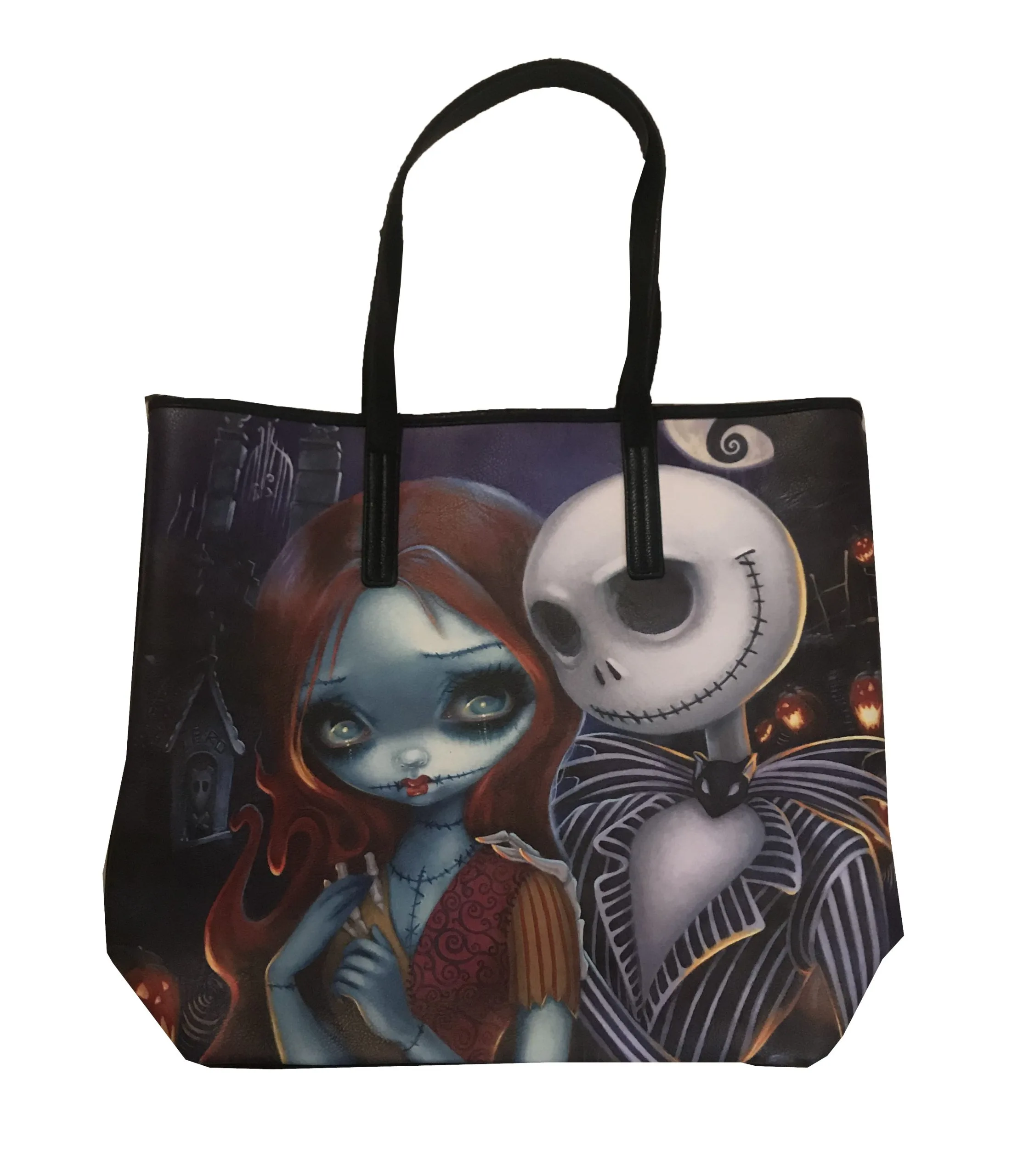Sweethearts Jack Skellington and Sally are pictured by renowned artist Jasmine Becket-Griffith in her distinctive style on this faux leather tote. The spacious bag features a special Tim Burton’s The Nightmare Before Christmas metal label.