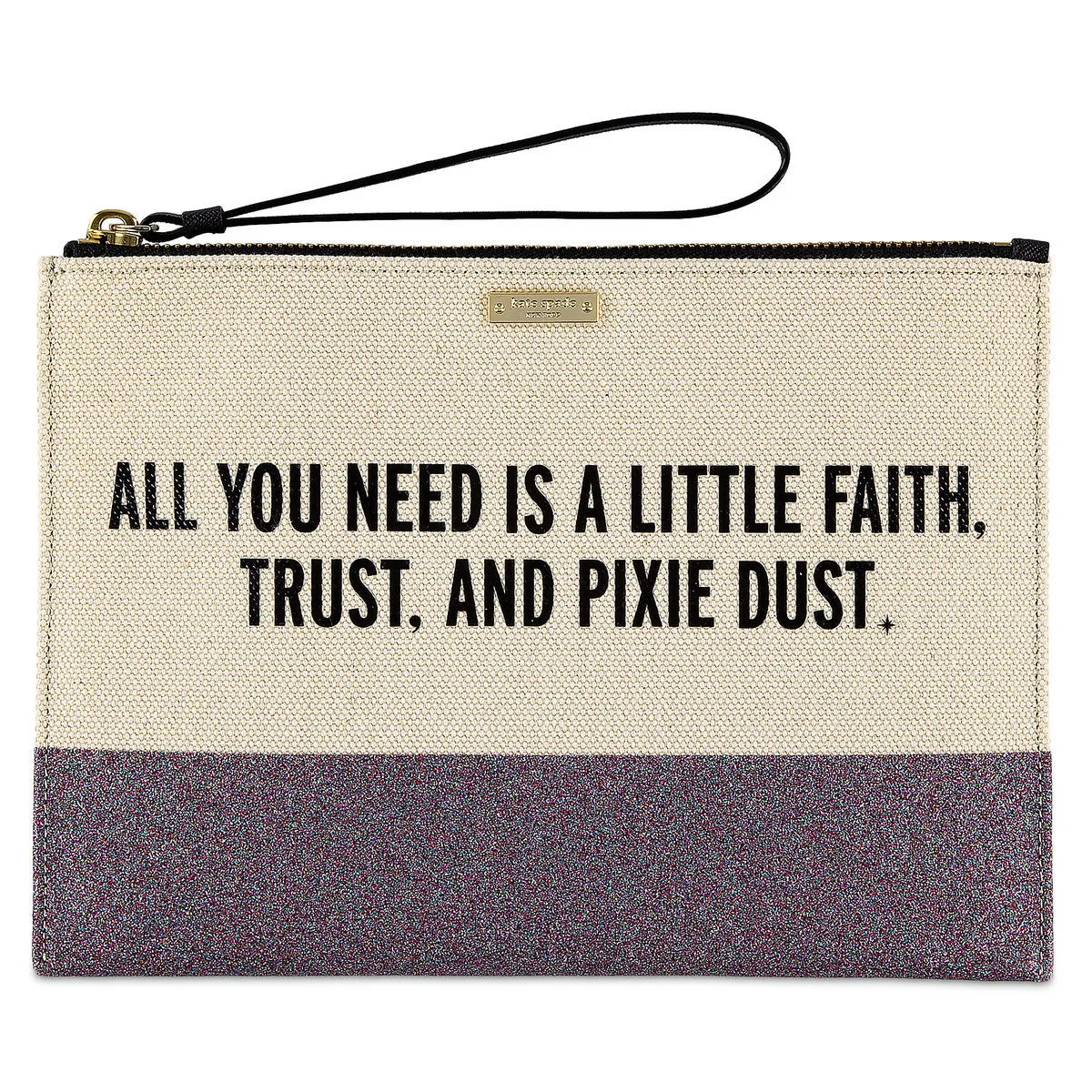 The secret of how to learn to fly is the message on this glamorous clutch by kate spade new york. The zip top bag with carry strap features sparkling multicolored glitter, and a quote inspired by Walt Disney’s 1953 classic Peter Pan.