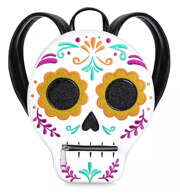 Make your look unforgettable with this Coco-inspired backpack by Loungefly. Accented with embroidered details and glittering appliqués, the sugar skull design has a small zip pocket for the mouth and a colorful lining featuring characters from the film.