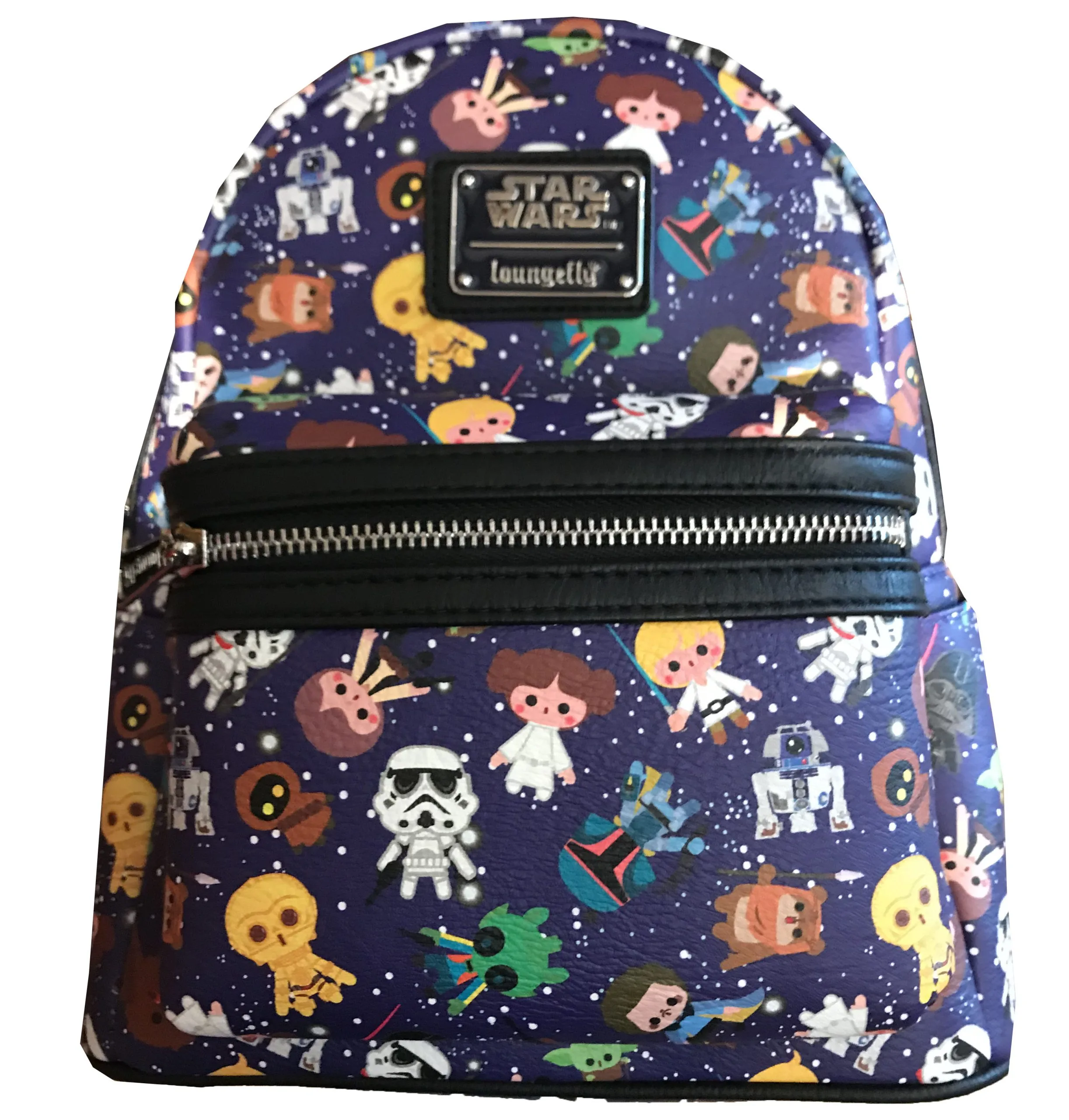 This Loungefly Backpack is covered in Star Wars Characters, With Boba Fett, Princess Leia, Stormtrooper, and more on your back they will make sure you smile on all your travels.