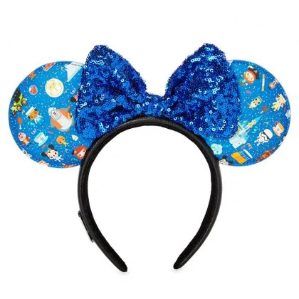 Mickey, the Hitchhiking Ghosts, Winnie the Pooh, Buzz Light Year, Dumbo are among the characters featured on the colorful allover Chibi-style print on this faux leather Minnie Ears by Loungefly.
