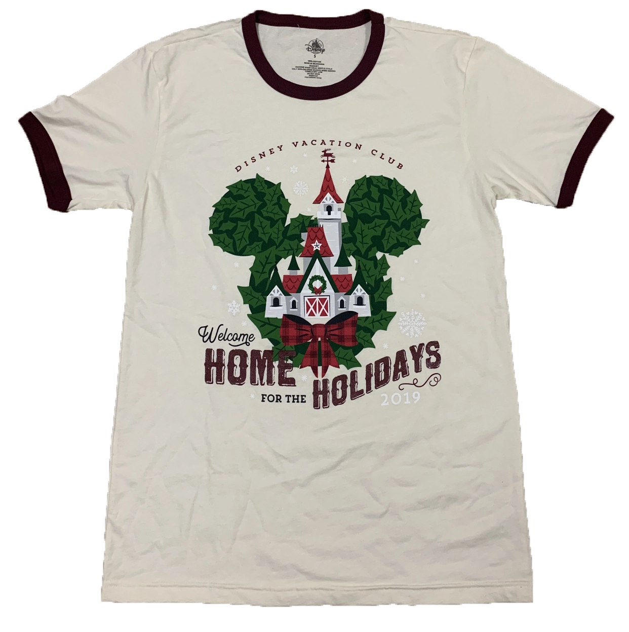 Bring in the holidays with this cotton Home for the Holidays Disneys Vacation Club Tee. Features a Holiday Mickey Wreath and Castle.