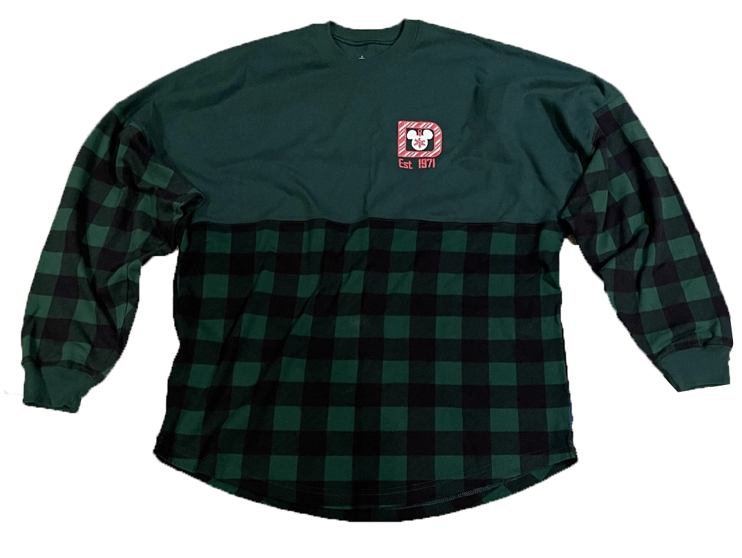 Show your holiday spirit in this festive plaid green spirit jersey with glittering puffy Walt Disney World Resort logo.