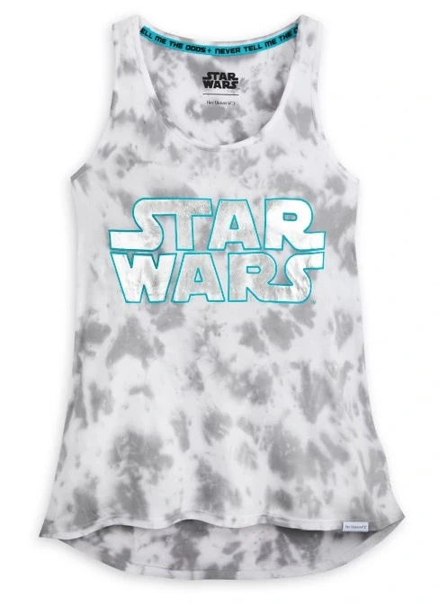 The Star Wars logo gleams against a ”cloud wash” tie-dye pattern on this fitted silhouette tank top by Her Universe with deep scoop neckline and flared high-low hem.